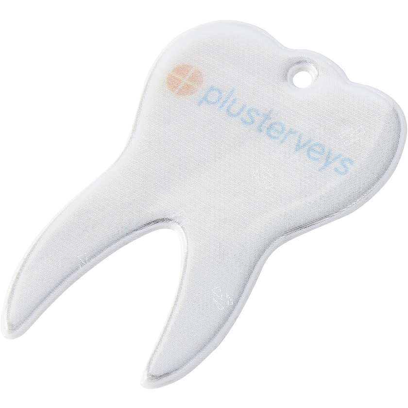 Mjukreflex formad som en tand. Passar perfekt för tandläkare! Levereras antingen med säkerhetsnål och snöre eller med kullänk. Reflexmaterialet uppfyller kraven i EN13356:2001. För att inte reflexförmågan ska skadas så sker trycket under reflexytan.