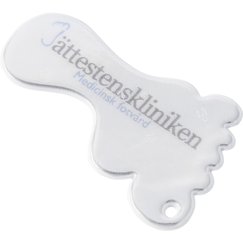 Mjukreflex i form av en fot. Perfekt för t ex företag inom fotvård och fotsjukvård. Levereras antingen med säkerhetsnål och snöre eller med kullänk. Reflexmaterialet uppfyller kraven i EN13356:2001. För att inte skada reflexförmågan sker trycket under reflexens yta.