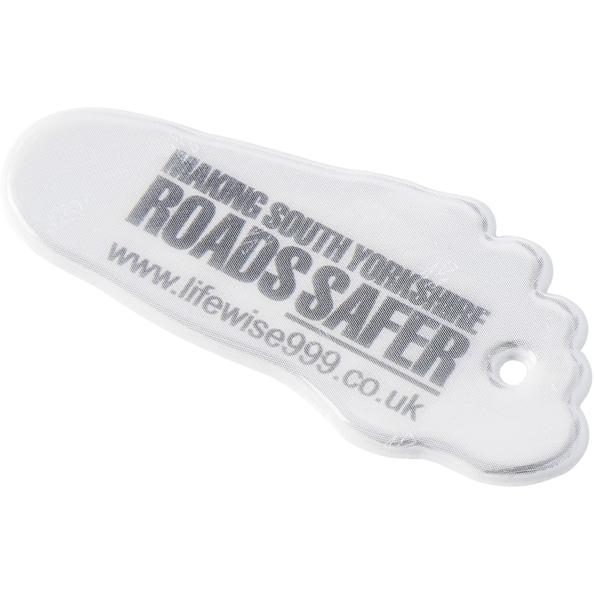 Kul mjukreflex i formen av en fot. Reflexen levereras antingen med snöre och säkerhetsnål eller med kullänk. Godkänt reflexmaterial i enlighet med EN13356:2001. Trycket sker under reflexytan.
