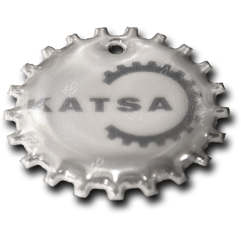 Mjukreflex i form av ett kugghjul. Reflexmaterialet kan antingen fås i vit eller gul färg. Levereras antingen med kullänk av metall eller med snöre och säkerhetsnål. Reflexmaterialet uppfyller kraven i EN13356:2001. För att inte reflexförmågan ska påverkas negativt sker trycket under reflexytan.