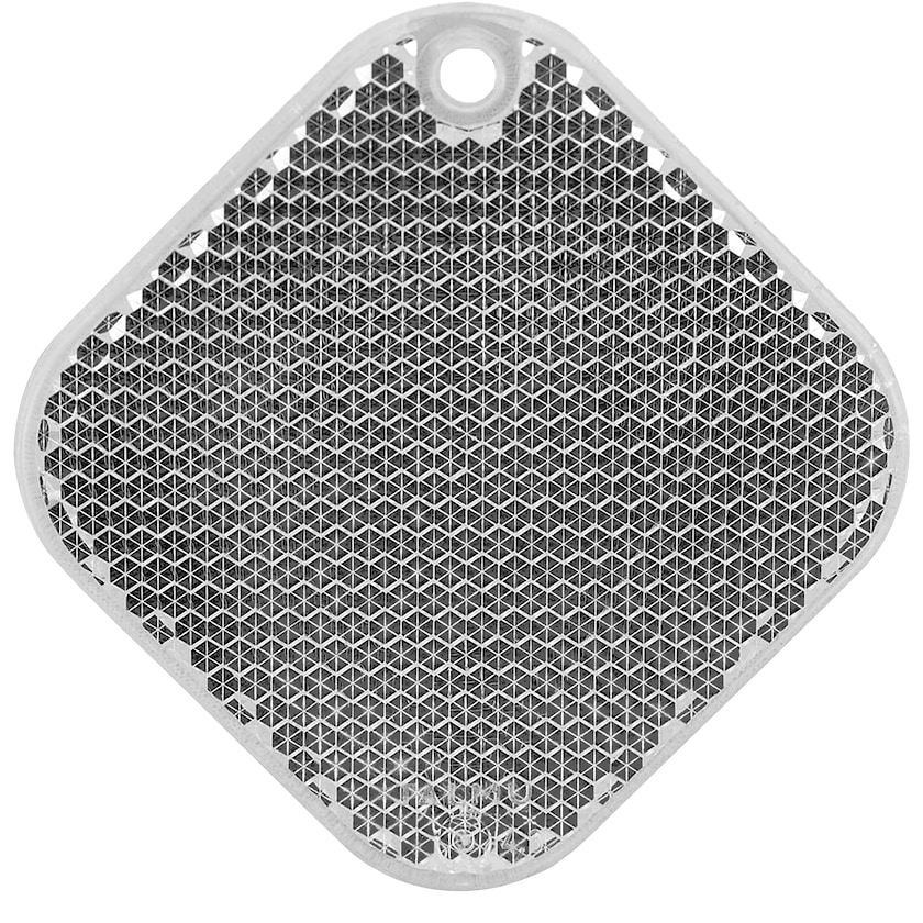 Kvadratisk reflexbricka av hårdplast. Producerad i Europa och godkänd i enlighet med CE EN 17353:2020 B1. Väj fritt mellan snöre och säkerhetsnål eller kullänk.