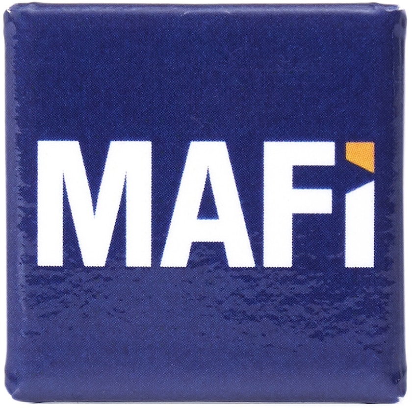 Liten kvadratisk reklamknapp. På baksidan finns en säkerhetsnål.