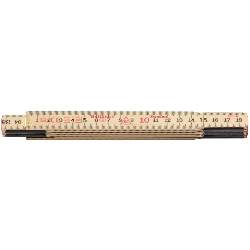 Hultafors tidlösa tumstock i 1-meters-version. Tumstocken är tillverkad av glasbjörk med leder av svenskt stål. Den metriska graderingen är svart med röda decimetersiffror och finns på båda sidor.