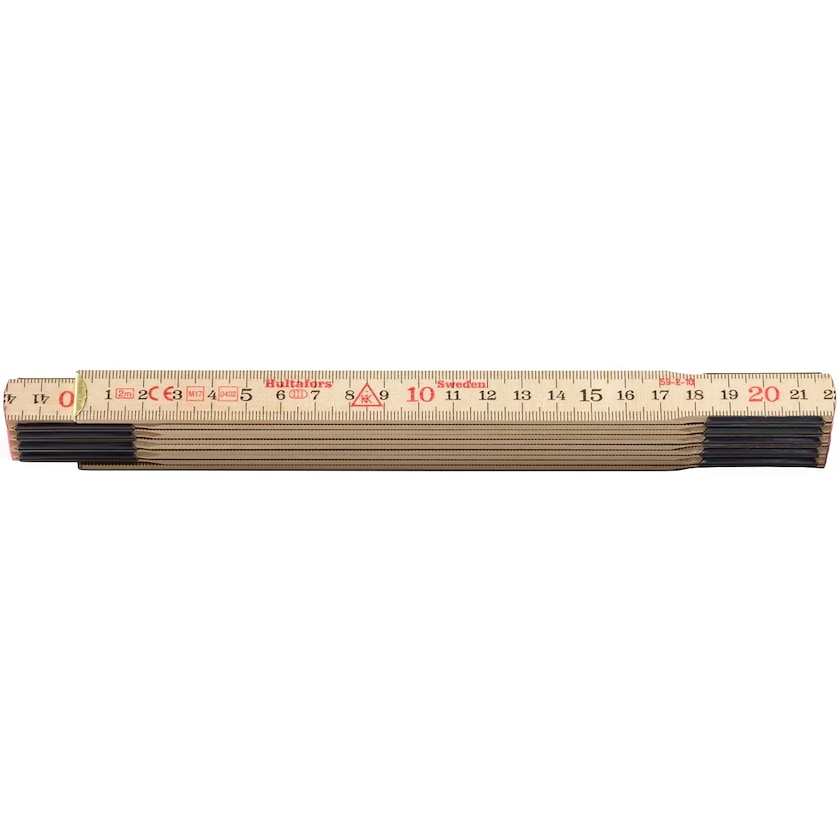 Hultafors klassiker, ett måste för varje hantverkare. Traditionellt tillverkad av glasbjörk med led av svenskt stål, som möjliggör tunna stickor och en smidig meterstock. Metrisk gradering i svart på båda sidor med röda decimetersiffror.