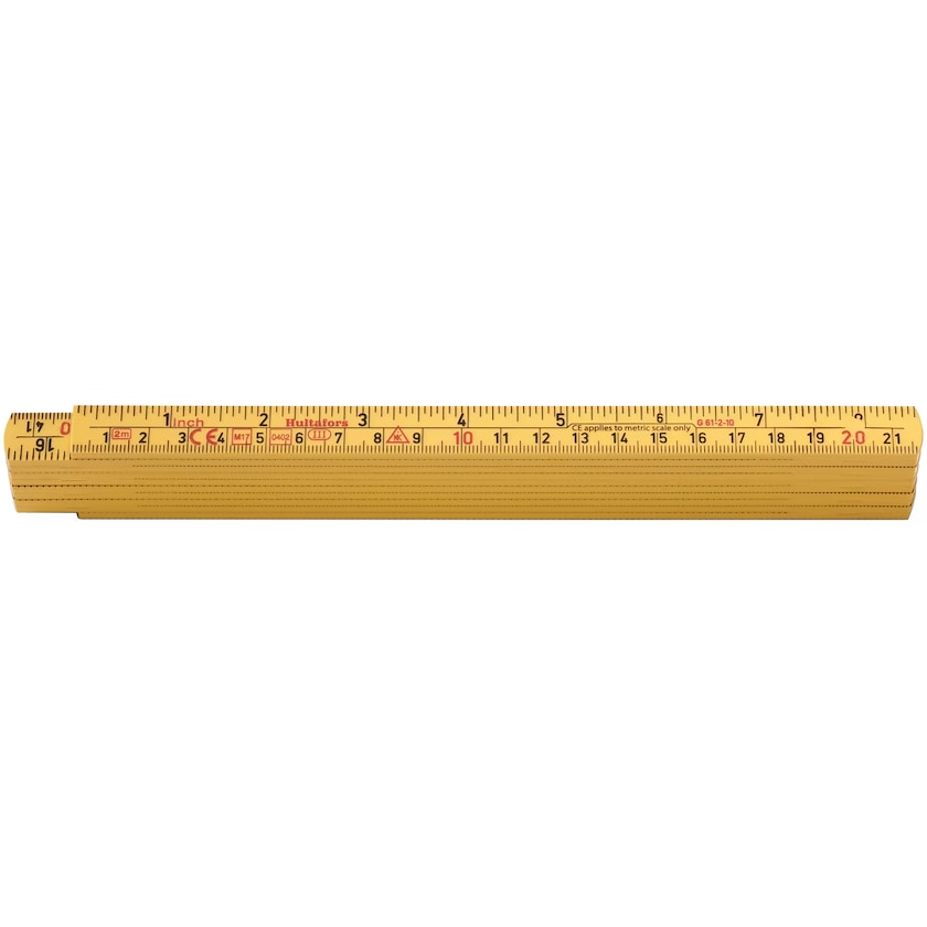 Gul tumstock av glasfiberförstärkt polyamid. Materialet har utmärkt motståndskraft mot fukt. Tumstocken har gradering med svarta siffror på båda sidor. I underkant är den metrisk och i överkant visar den engelsk tum.
