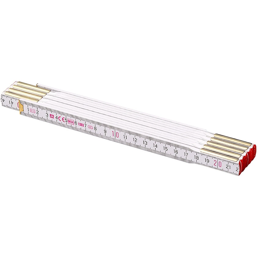 2-meters trätumstock för professionellt bruk. Tumstocken är tillverkad av bok och har mässingsöverdragna och extra förstärkta stålleder. Lederna är osynliga från utsidan. Träet är målat med två lager färg och dessutom försett med ett skyddande ytskikt. Tumstocken tillverkas och trycks i EU och uppfyller EC type-examination certificate, EC-accuracy class III och EC conform.