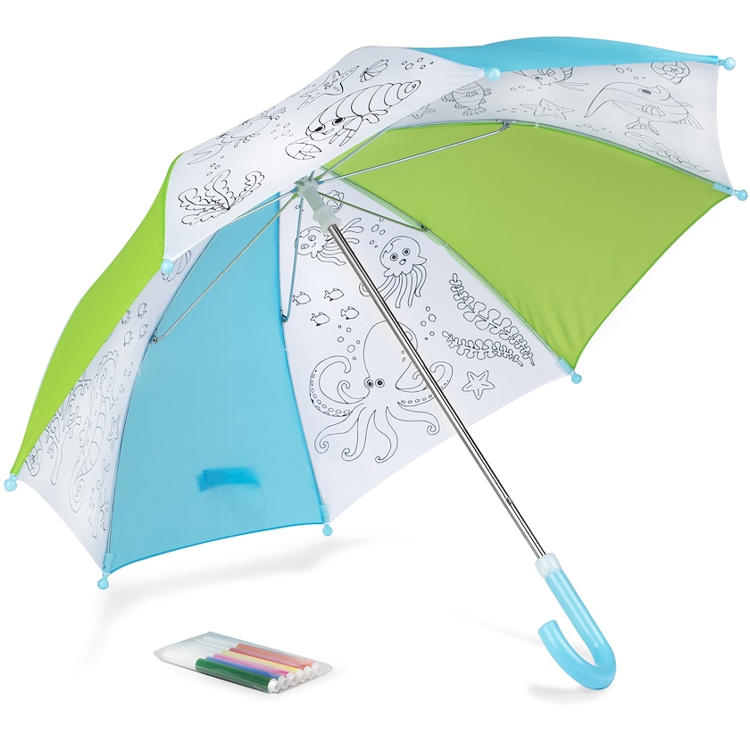 Barnparaply som går att rita på. 6 st färgpennor medföljer. Paraplyet är manuellt. En profilprodukt som både är praktisk och kul för barnen!