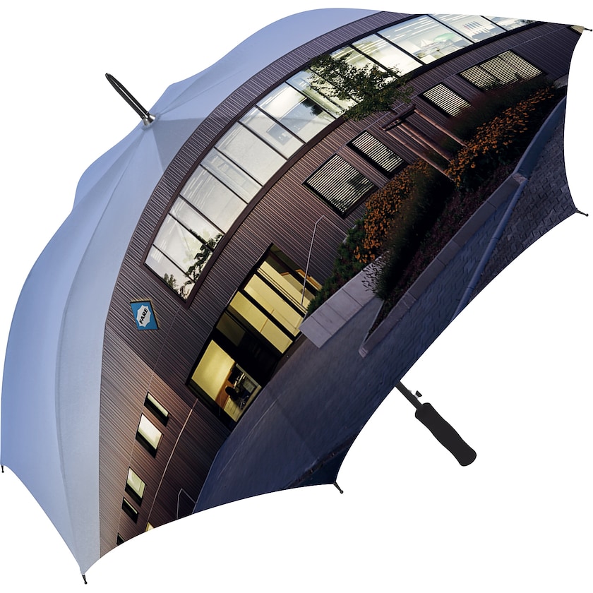 Golfparaply med tryck på hela tyget. Paraplyet har förstärkt konstruktion som klarar kraftiga vindbyar. Ribborna är tillverkade av glasfiber och paraplystången är gjord av galvaniserat stål. Handtaget är mjukt gummerat. Paraplyet tillverkas i fabrik efter beställning vilket gör att leveranstiden är längre än vanligt.