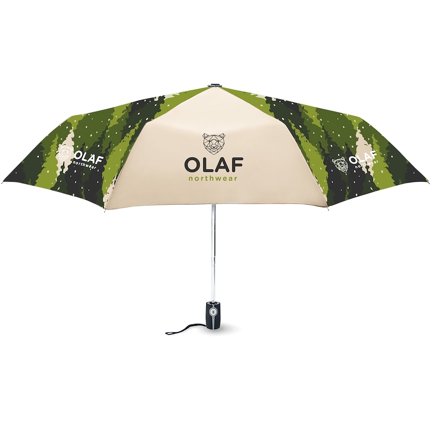 Miljövänligt kompaktparaply med tyg som designas helt av dig. Davis är av 3-sektionstyp och håller mycket hög kvalitet. Ribborna är av glasfiber. Paraplyet har automatisk öppning och stängning. Hela tyget trycks efter dina önskemål och sys sedan på paraplyets konstruktion. Levereras med ett fodral som matchar paraplyets design. Tryckpriset avser endast tryck på paraplyets utsida.