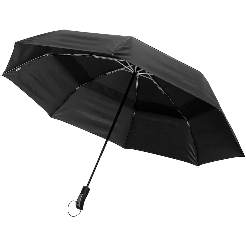Miljövänligt paraply som är stormsäkert. Paraplyet har stång av aluminium och ribbor av glasfiber. Öppning och stängning sker automatiskt. Tyget är tillverkat av återvunnen polyester.