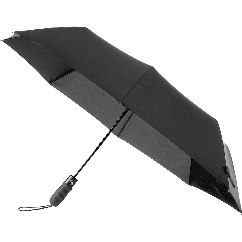 Påkostat kompaktparaply med tryck. Paraplyet har paraplystång och ribbor av metall. Handtaget är mycket bekvämt att hålla i. Automatisk uppfällning.