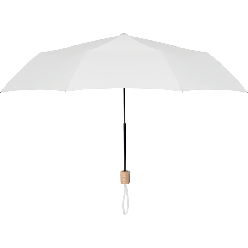 Miljövänligt kompaktparaply som kan köpas från 10 st. Paraplyet har tre sektioner och är tillverkat av rPET, dvs återvunna PET-flaskor. Ribborna är svarta och handtaget av naturfärgat trä. Manuell öppning och stängning.