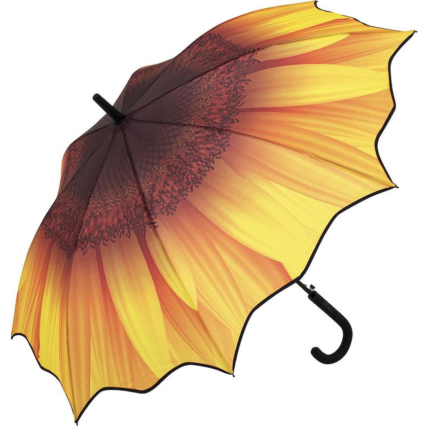 Paraply med förtryckt motiv av antingen en solros eller blad. Nicol har en förstärkt stormsäker konstruktion med ribbor av glasfiber och paraplystång av galvaniserat stål.