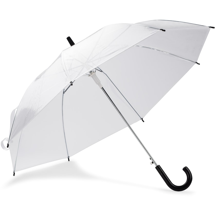 Transparent paraply med böjt handtag. Uppfällningen är automatisk. Tryck kan ske i maximalt tre färger.