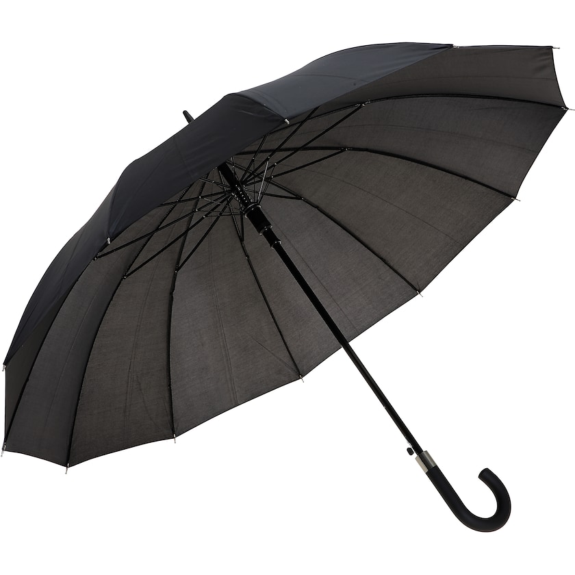 Helsvart paraply med tolv paneler. Paraplyet har gummerat handtag och automatisk öppning.