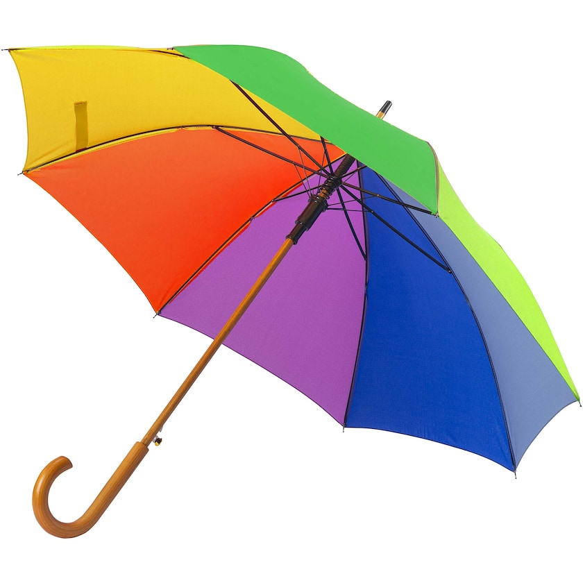 Automatiskt paraply med regnbågsfärgat tyg. Handtaget är gjort av trä och paraplystången och ribborna av metall.