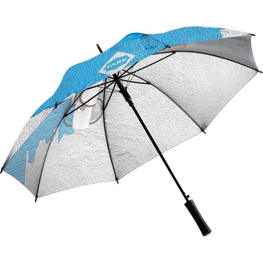 Paraply av hög kvalitet med tryck över hela tyget. Paraplyet har en förstärkt konstruktion som klarar kraftiga vindbyar. Ribborna är av glasfiber och paraplystången av galvaniserad svart stål. Hela tygets ovansida trycks efter dina önskemål. Leveranstiden är lång eftersom paraplyerna tillverkas direkt i fabrik efter beställning.