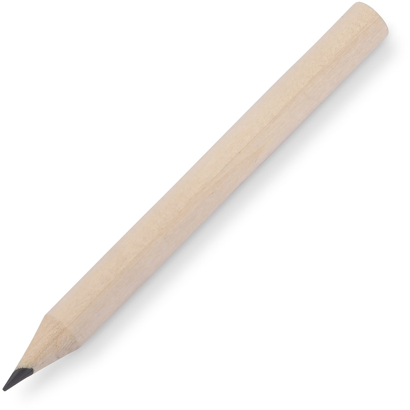 Kort blyertspenna med tryck. Pennan är naturfärgad och har en längd på 85 mm. Levereras spetsad.