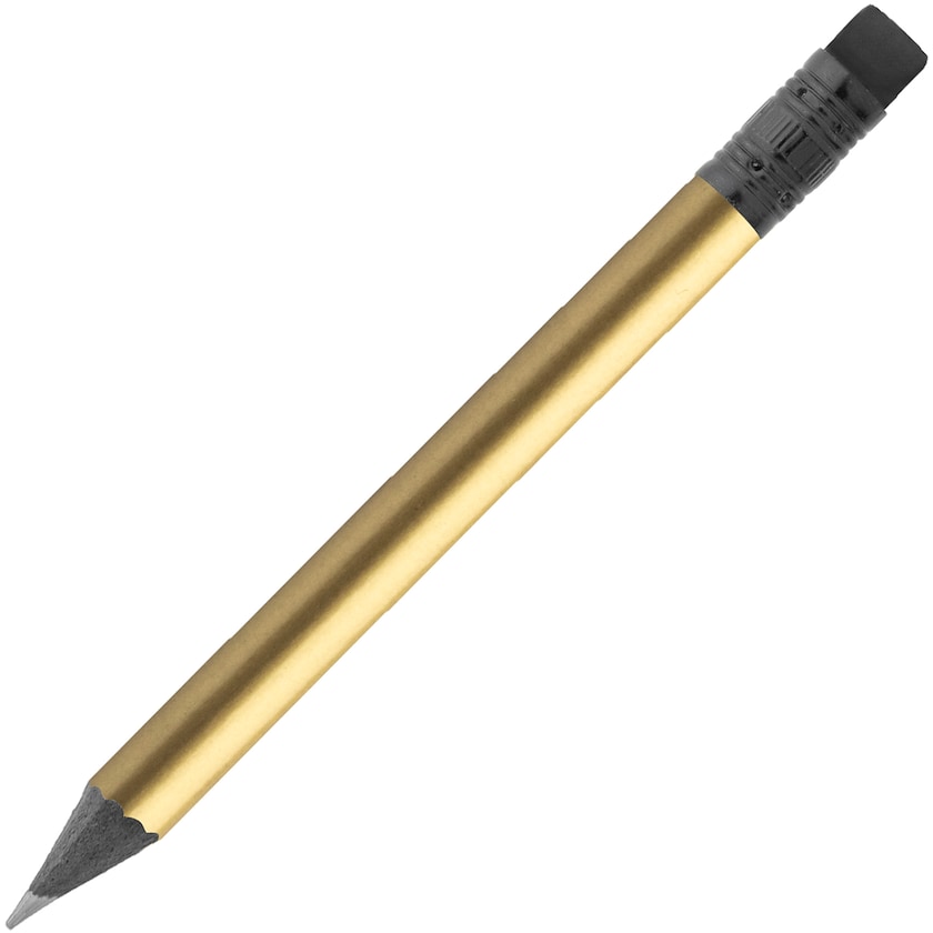 Liten blyertspenna med svart trä och svart radergummi. Blyertsen har hårdheten HB. Levereras vässade.