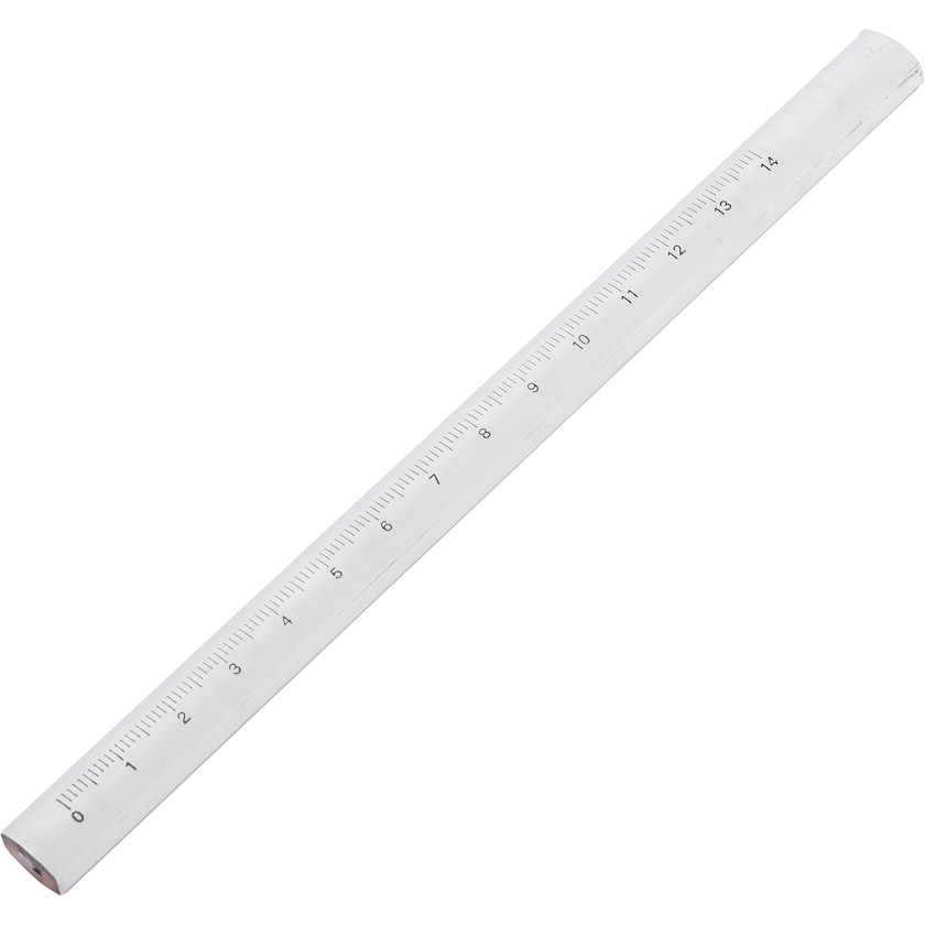 Snickarpenna med måttangivelser. Tack vare måttangivelserna fungerar snickarpennan också som mätinstrument. Blyertsen har hårdheten F.