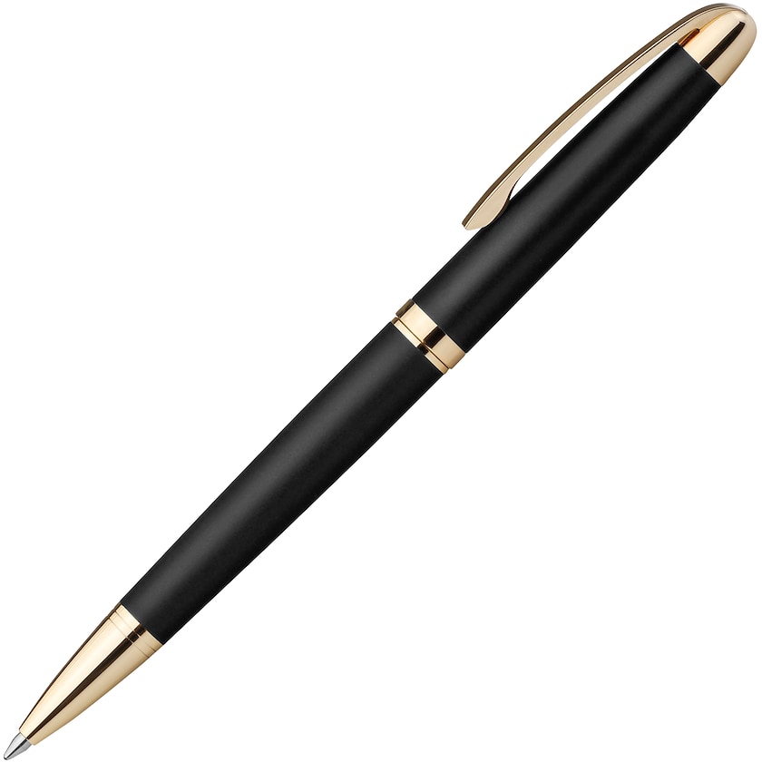 Metallpenna med detaljer i guldfinish. Pennan har vridmekanism och blått bläck. Levereras individuellt förpackad i en svart pappersask.