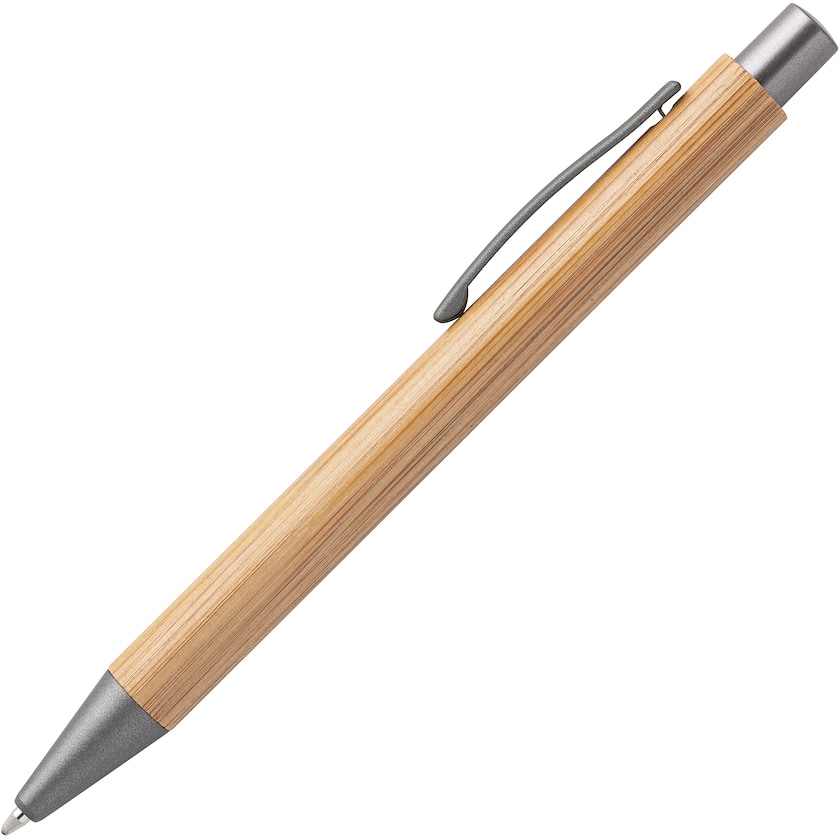 Elegant penna av bambu och metall. Bläckpatronen har blått bläck.