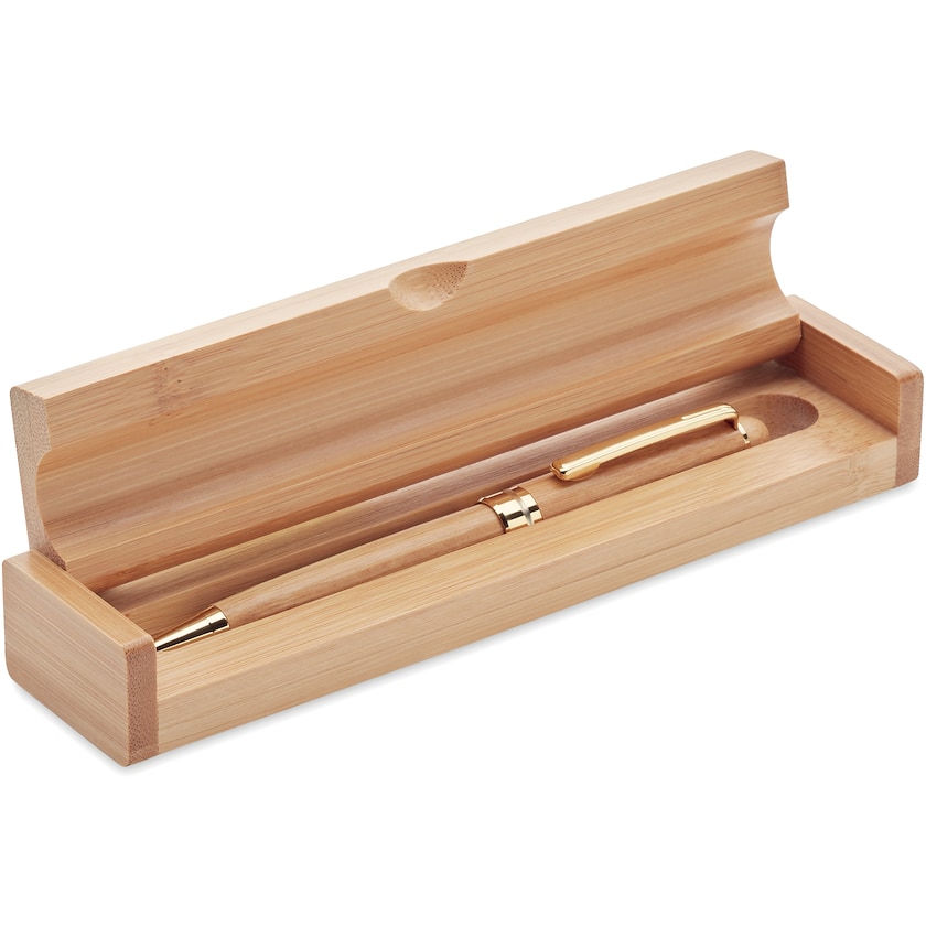 Lyxig penna av guldkromad metall och bambu. Pennan levereras i en lyxig presentlåda som även den är tillverkad av bambu. Trycket kan antingen ske på pennan eller på presentlådan.