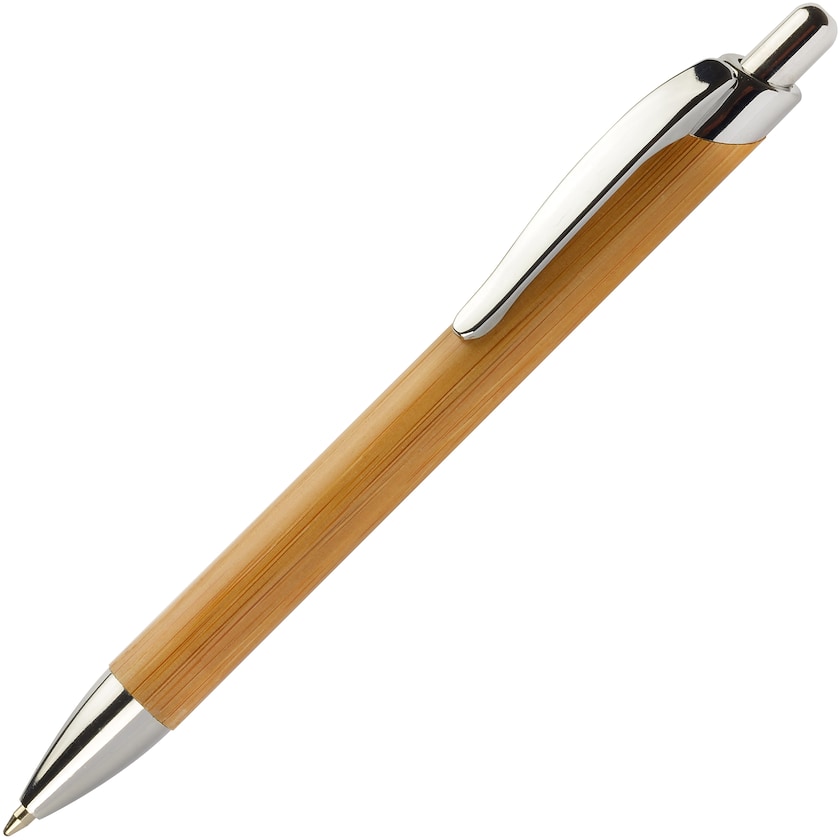 Elegant penna med pennkropp av bambu. Pennans detaljer är i metall. Märkning sker med tryck.