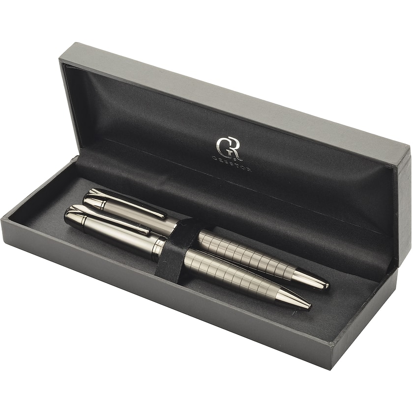 Lyxigt pennset med modernt designade pennor. Setet innehåller en kulspetspenna och en bläckpenna av metall. Lasergravyrpriset avser märkning på en av pennorna. Ett perfekt val för dig som letar efter ett pennset med modernt designade pennor. Pennorna har svart bläck.