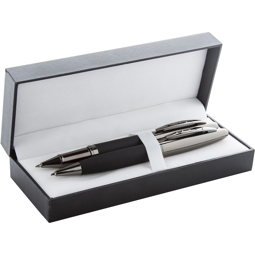 Modernt pennset med bläckpenna och kulspetspenna. Metallpennorna har gummerad greppyta och metallytor i gunmetal-färg. Pennorna har blått bläck. Märkning sker antingen med tryck eller lasergravyr. Märkningspriset avser märkning på en av pennorna.