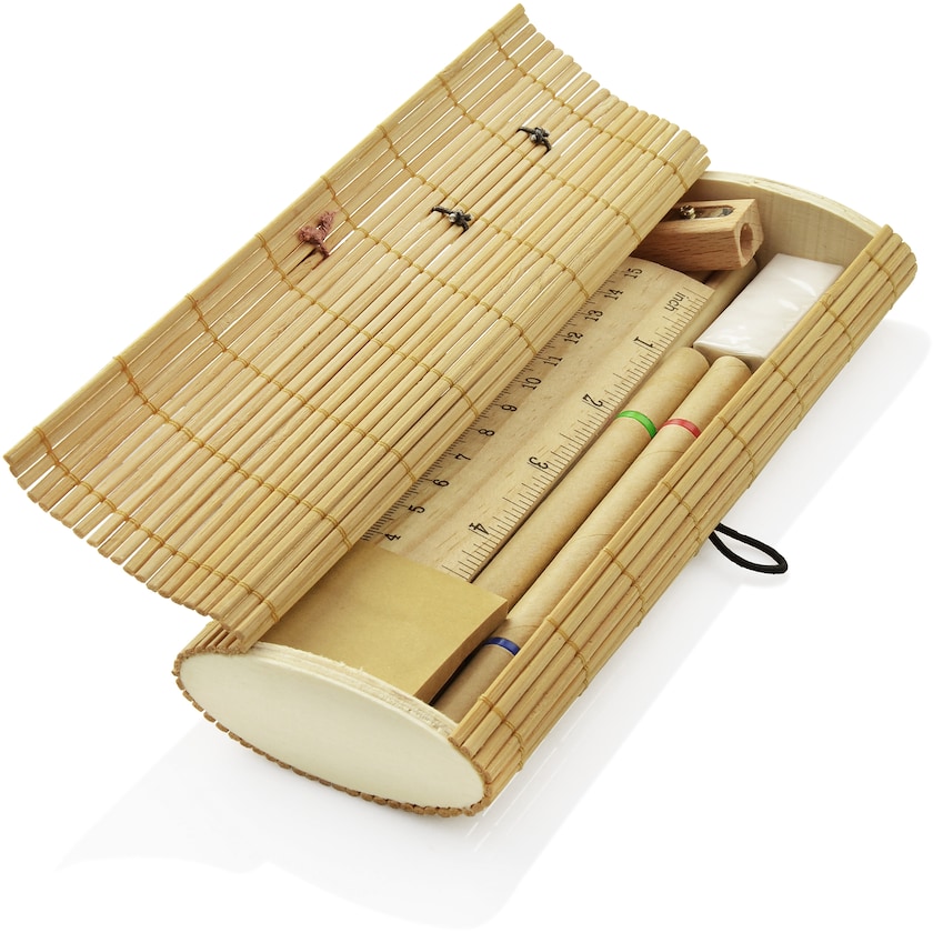 Trevligt pennset av bambu. Pennsetet innehåller två bläckpennor med rött, blått, svart och grönt bläck, två blyertspennor, radergummi, pennvässare och linjal i trä. Märkning sker med lasergravyr på en träbricka som finns på själva pennfodralet.