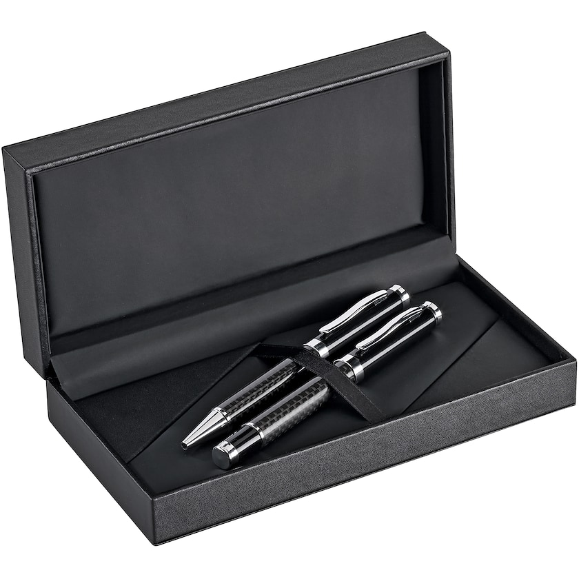 Exklusivt set med två pennor av metall och kolfiber. Setet innehåller en kulspetspenna och en bläckpenna. Kulspetspennan har vridmekanism. Pennorna har svart bläck. Märkningspriset avser märkning på en av pennorna.
