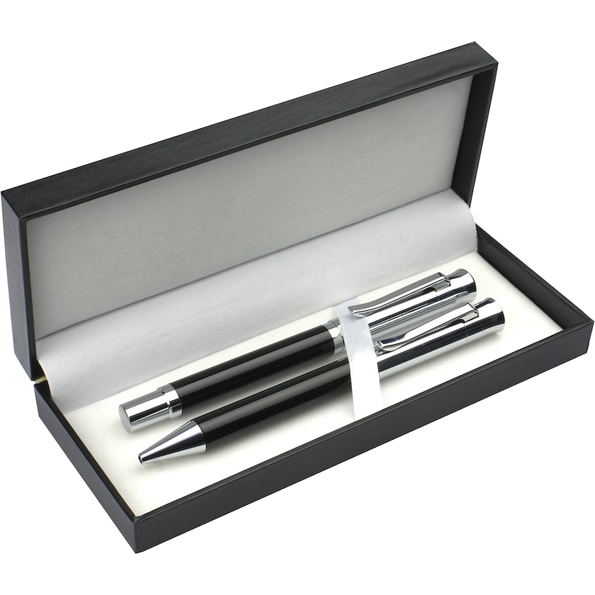 Set med metallpennor med mycket krom och konstläder. Pennorna märks med lasergravyr och presentlådan kan tryckas. Lasergravyrpriserna avser märkning på en av pennorna.