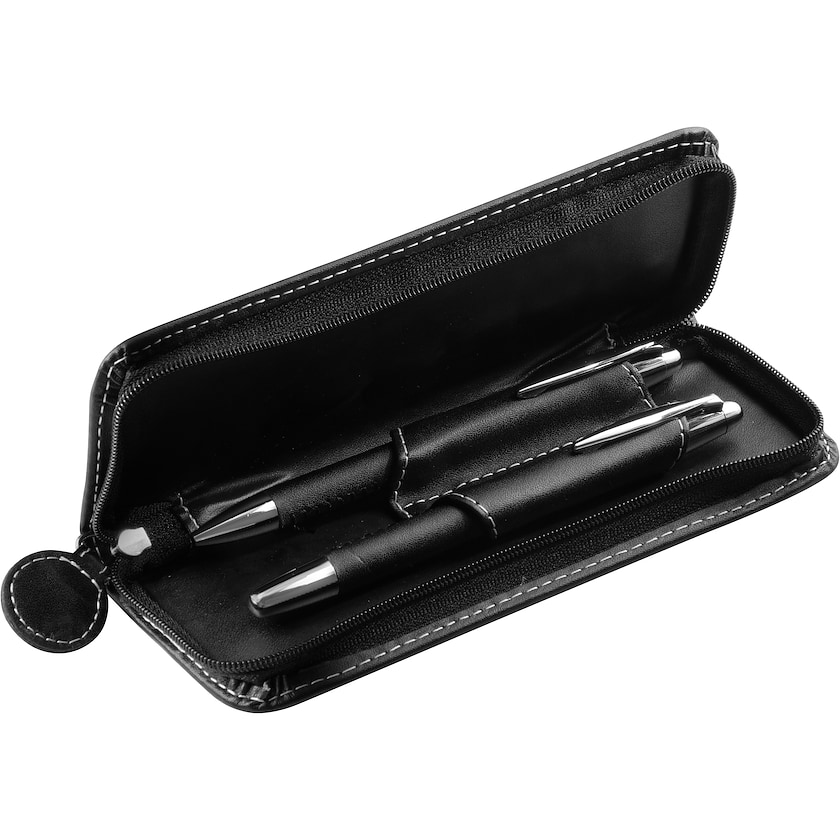Två metallpennor i praktiskt konstläderfodral. En av pennorna är en kulspetspenna och den andra en bläckpenna. Priset för lasergravyr inkluderar märkning på båda pennorna.