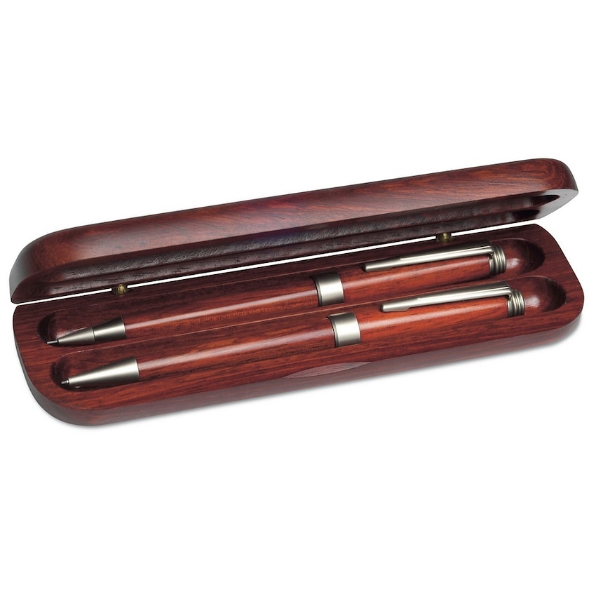 Exklusivt pennset med pennor och ask av trä. Setet innehåller en kulspetspenna och en stiftpenna.