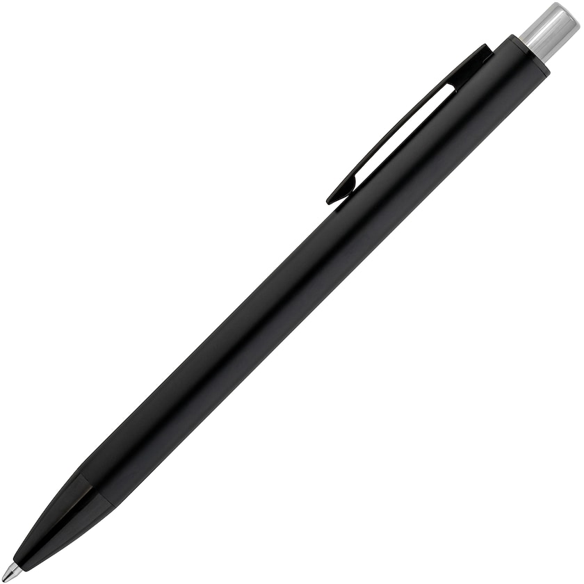Reklampenna av mattborstad aluminium. Knappen har blank finish. Vid märkning med lasergravyr framträder lasergravyren i samma färg som knappen.