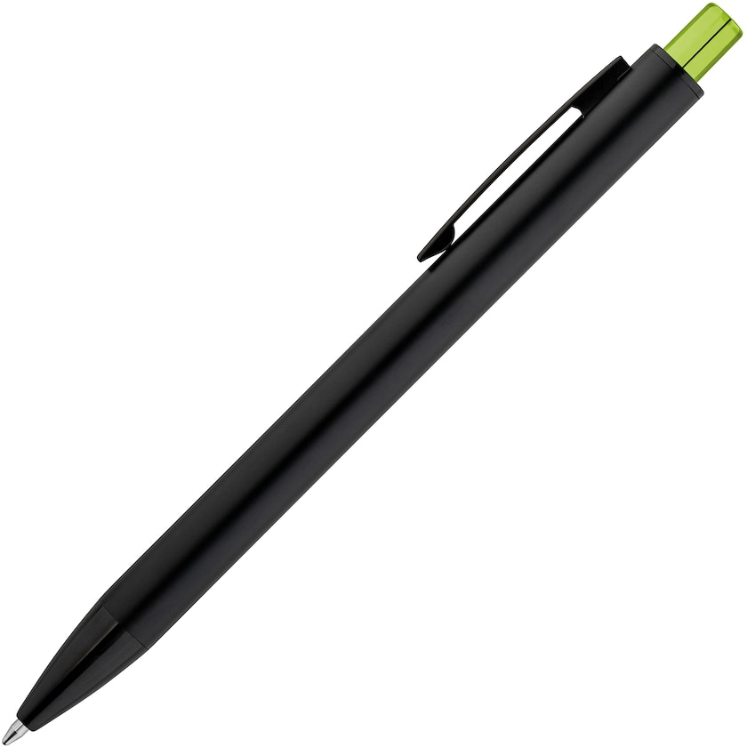 Reklampenna av mattborstad aluminium. Knappen har blank finish. Vid märkning med lasergravyr framträder lasergravyren i samma färg som knappen.