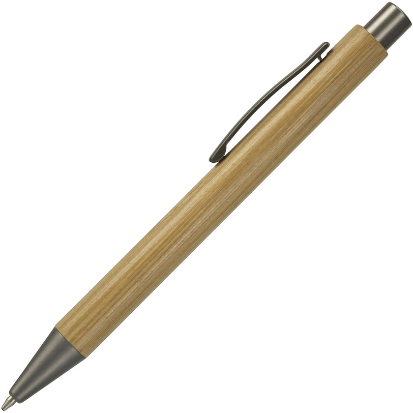 Penna av bambu med klips av metall. Detaljerna är lackade i en mörkgrå metallicfärg. Pennan är ett bra miljöval då bambu är ett miljövänligt material som odlas klimateffektivt.