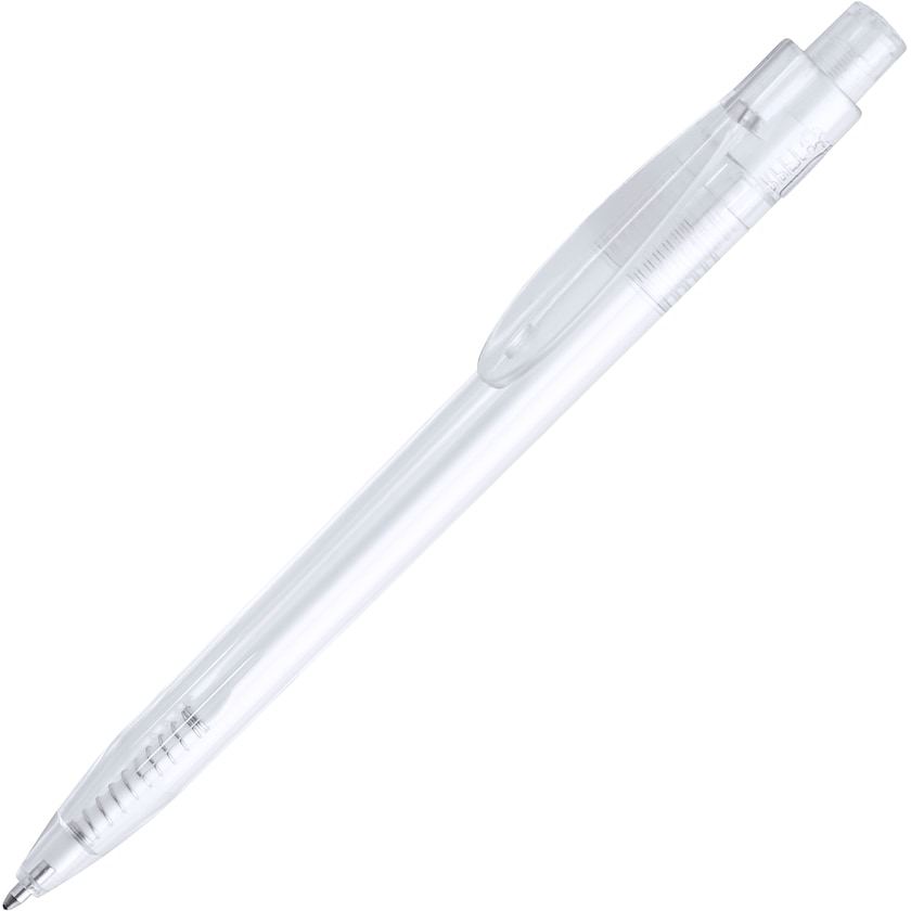 Prisvärd reklampenna av miljövänligt rPET. Pennan har blått bläck. rPET är framställt av återvunna PET-flaskor.