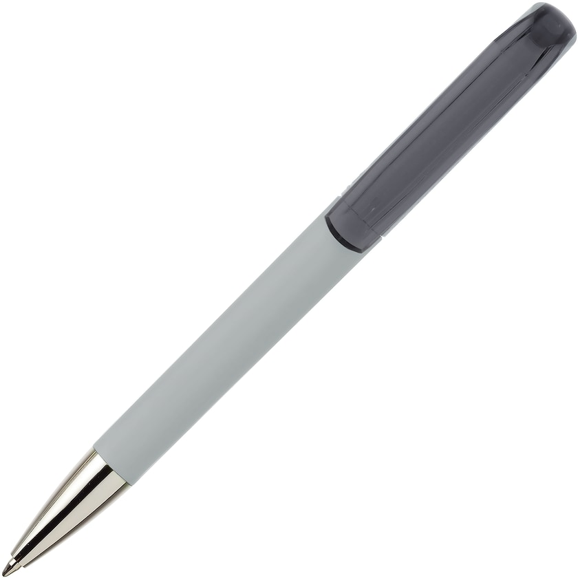Högkvalitativ reklampennna med gummerad pennkropp. Pennan har blankpolerad metallspets och transparent klips som det det går att trycka på.