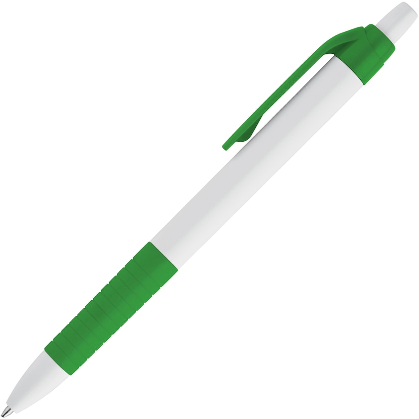 Reklampenna med vit pennkropp och kontrastfärgade detaljer. Pennan har ett skönt gummigrepp och klips i matchande färg.