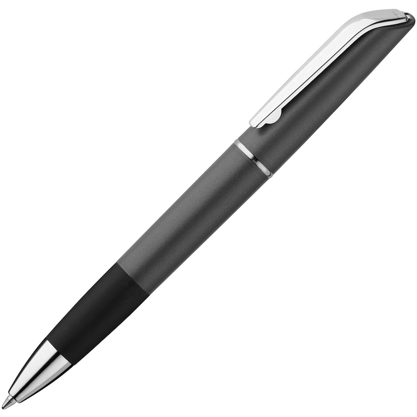 Metallicfärgad penna med grepp och många kromade detaljer.