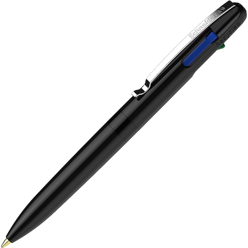 Penna från Schneider med fyra olika bläckfärger. Take 4 Promo har bläckfärgerna svart, blå, röd och grön. Du byter färg med en enkel knapptryckning. Pennkroppen är gjord av återvunnen plast och pennan är klimatneutralt producerad.