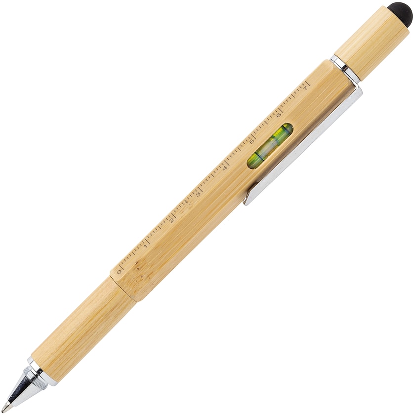 Mångfunktionell verktygspenna av bambu. Innehåller 7 cm linjal, vattenpass, skruvmejsel, touchfunktion och bläckpenna med blått bläck. Levereras i en snygg presentlåda. Den händiges bästa vän!