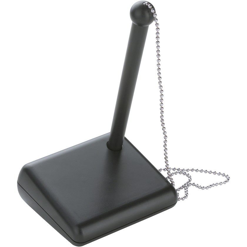 Penna med kedja fäst i ett pennställ. Trycket kan antingen ske på pennan eller på pennstället. Kedjan är av metall och är 50 cm lång. Levereras i en silverfärgad presentlåda.