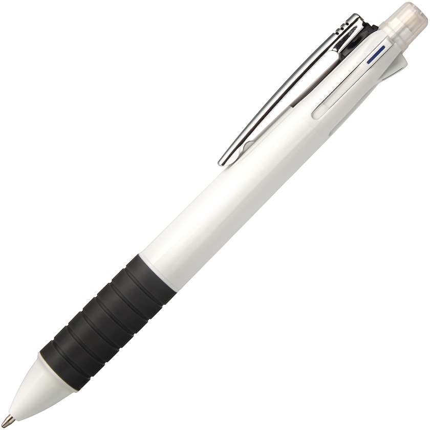 Flerfunktionspenna med fyra olika bläckfärger samt blyertsstift. Bläckfärgerna är blått, svart, rött och grönt. Blyertsstiftet är 0,5 mm tjockt. Blyertsstiftet kan fyllas på vid behov. Upptill finns ett radergummi.