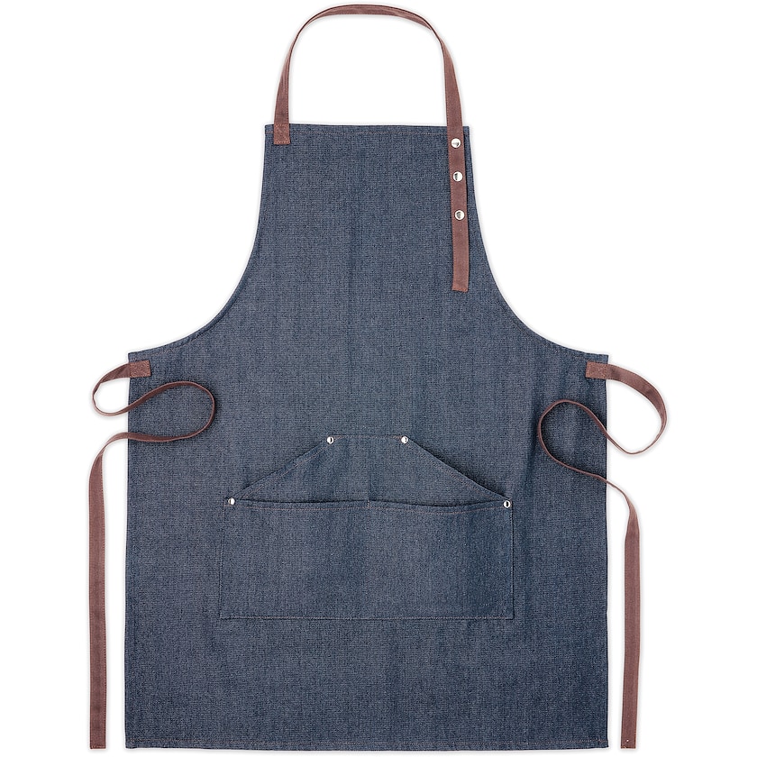 Förkläde av denimtyg och bruna bomullsremmar. Denimtyget ger förklädet en modern framtoning. Framtill finns tre fickor. Varje förkläde kommer individuellt förpackade i en presentkartong.