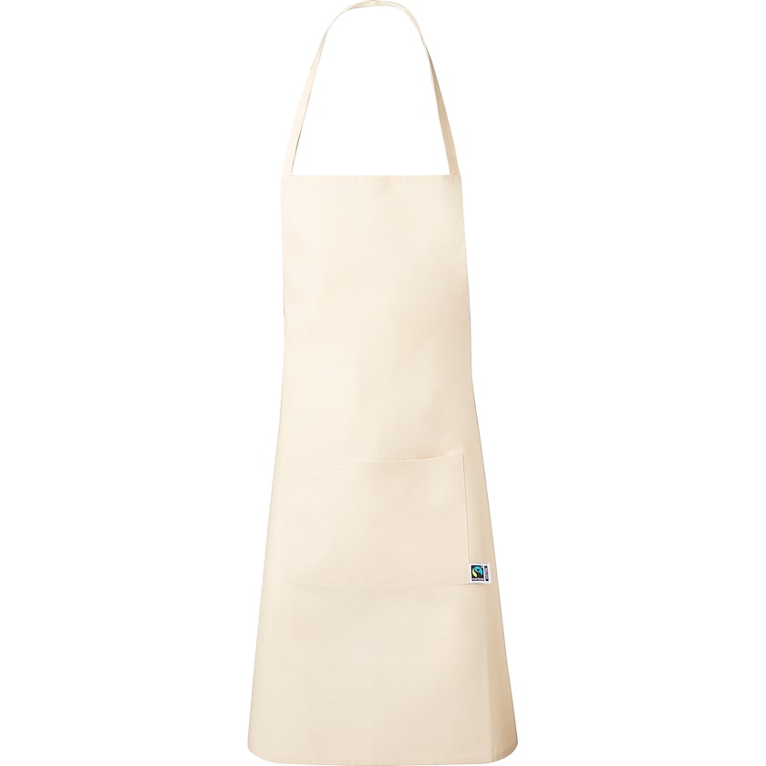 Förkläde av Fairtrade-certifierad bomull. Framtill finns en stor ficka med en etikett som visar att förklädet är tillverkat av Fairtrade-certifierad bomull.