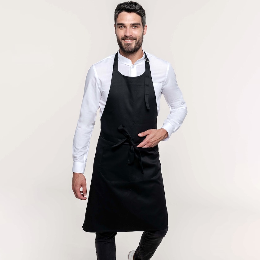 Förkläde för professionellt bruk som klarar industritvätt. Förklädet klarar tvätt i vanlig tvättmaskin upp till 60 grader och industritvätt upp till 85 grader i enlighet med ISO 15797. Framtill finns en stor ficka med två utrymmen. Förklädet har en längd på 90 cm och en bredd på 76 cm.
