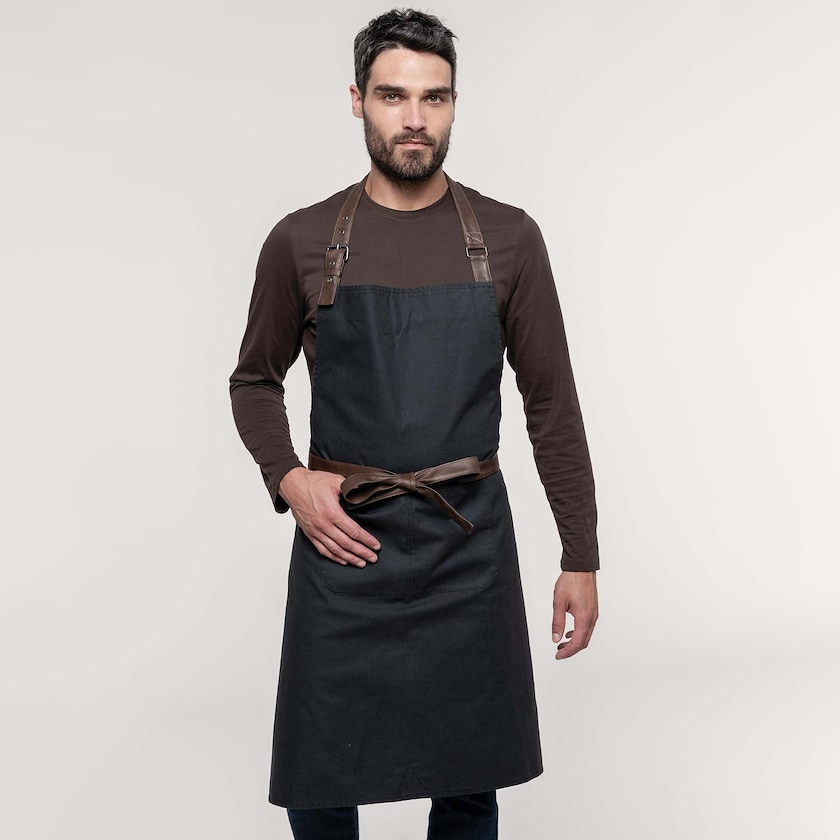Förkläde med vintage-look. Tyget är specialbehandlat så att det har ett lätt åldrat utseende. Framtill finns en stor ficka med två förvaringsutrymmen. Förklädet har 90 cm längd och 76 cm bredd.